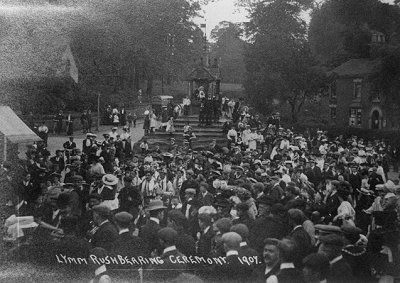 C. E. Ardern in his 1900 edition of "An Illustrated Guide to Lymm and District" says that "Up to about 1881 a rushcart paraded the streets each Rushbearing drawn by grey horses" and that "Two troups of Morris Dancers paraded the village each Rushbearing Saturday until a few years ago."