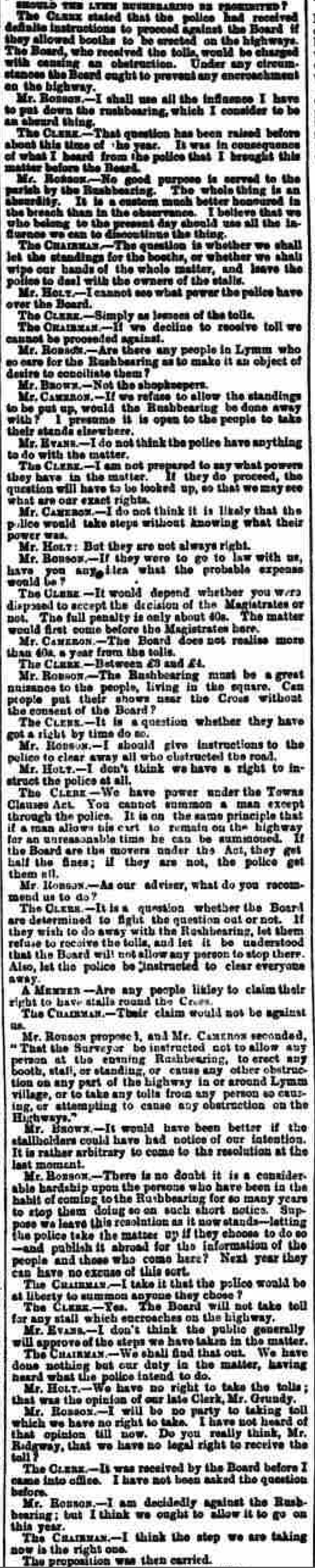 "That the surveyor be instructed not to allow any person at the coming Rushbearing, to erect any booth, stall, or